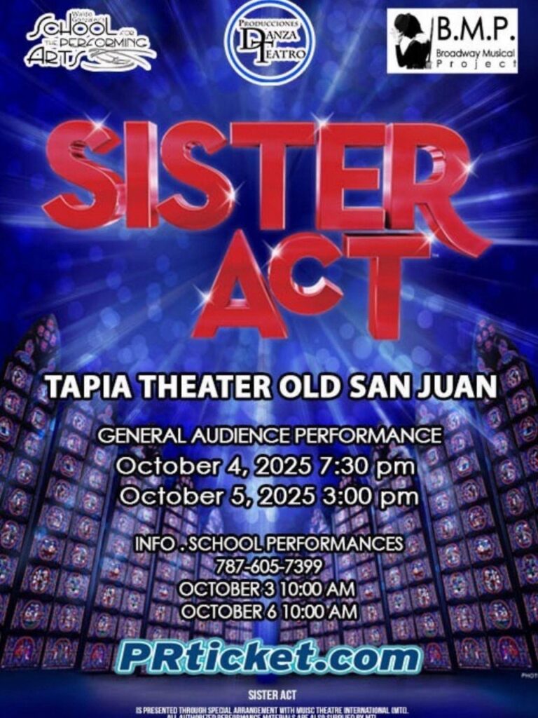Con humor, ritmo y mucha emoción, Sister Act celebra el poder de la música para unir mundos opuestos y recordarnos que la alegría puede surgir en los lugares más inesperados.  Sister Act se presentará en funciones escolares el viernes, 3 y lunes, 6 de octubre a las 10:00 a.m. y para el público en general el sábado, 3 de octubre a las 7:30 p.m. y el domingo, 4 de octubre a las 3:00 p.m. Boletos disponibles a través de PRtickets.com.